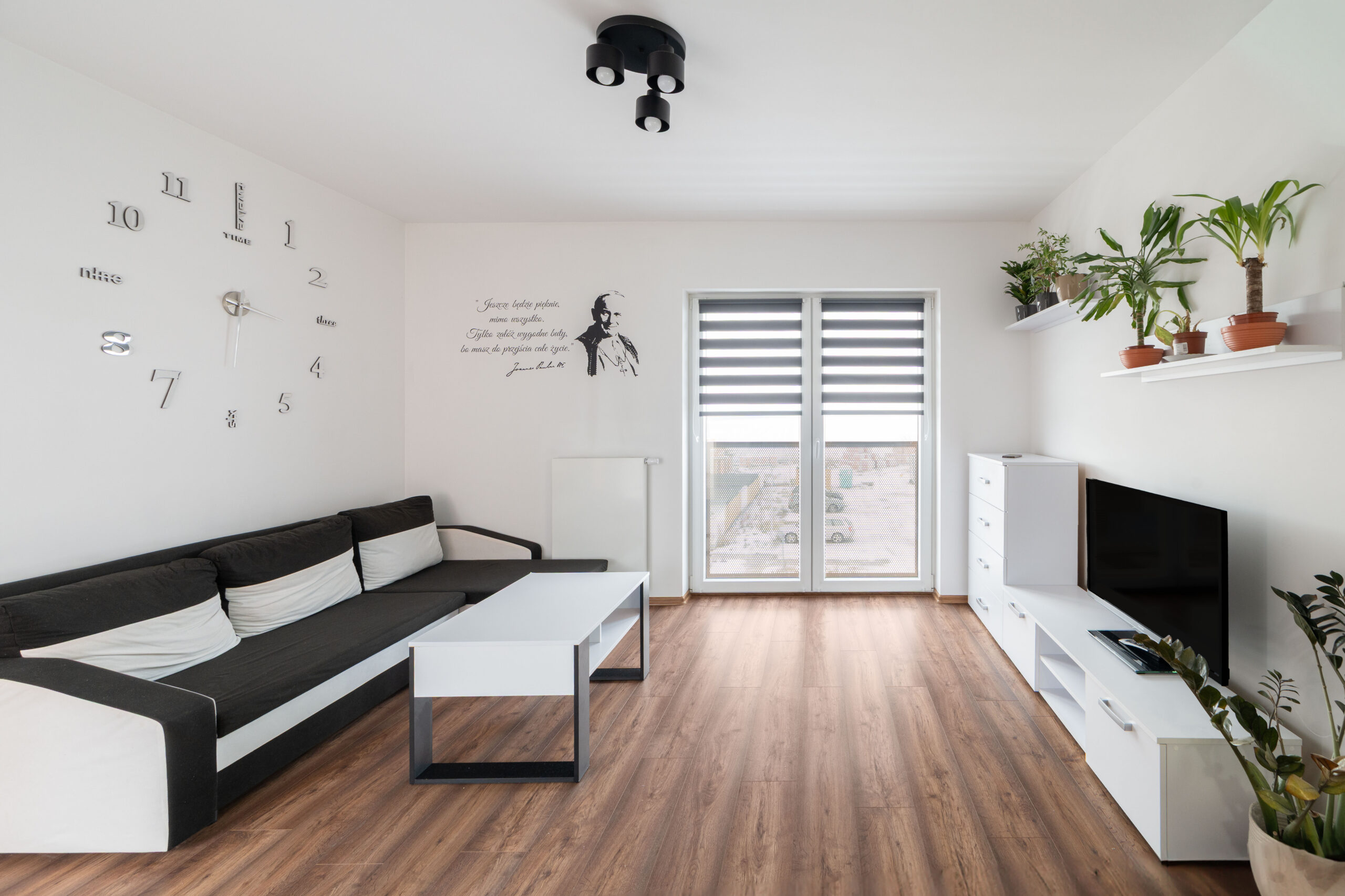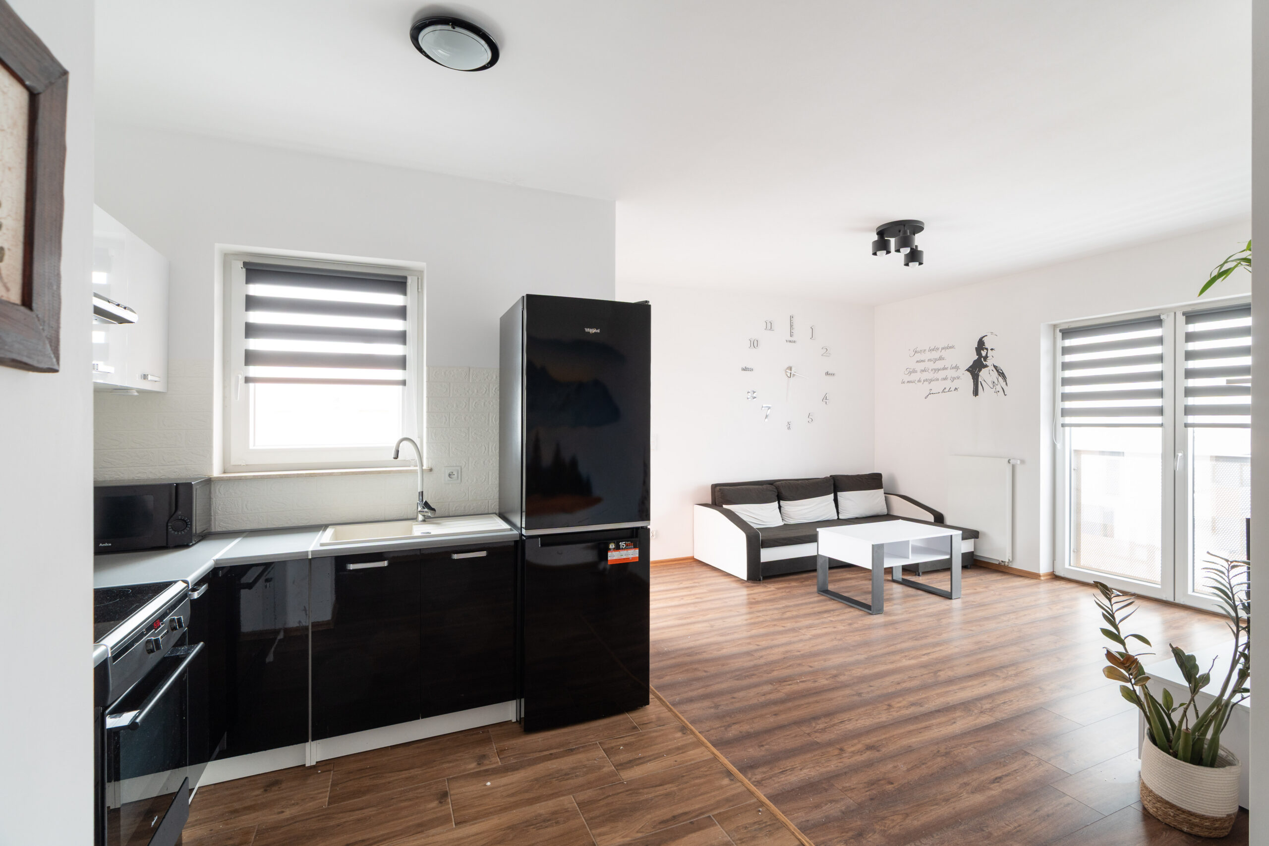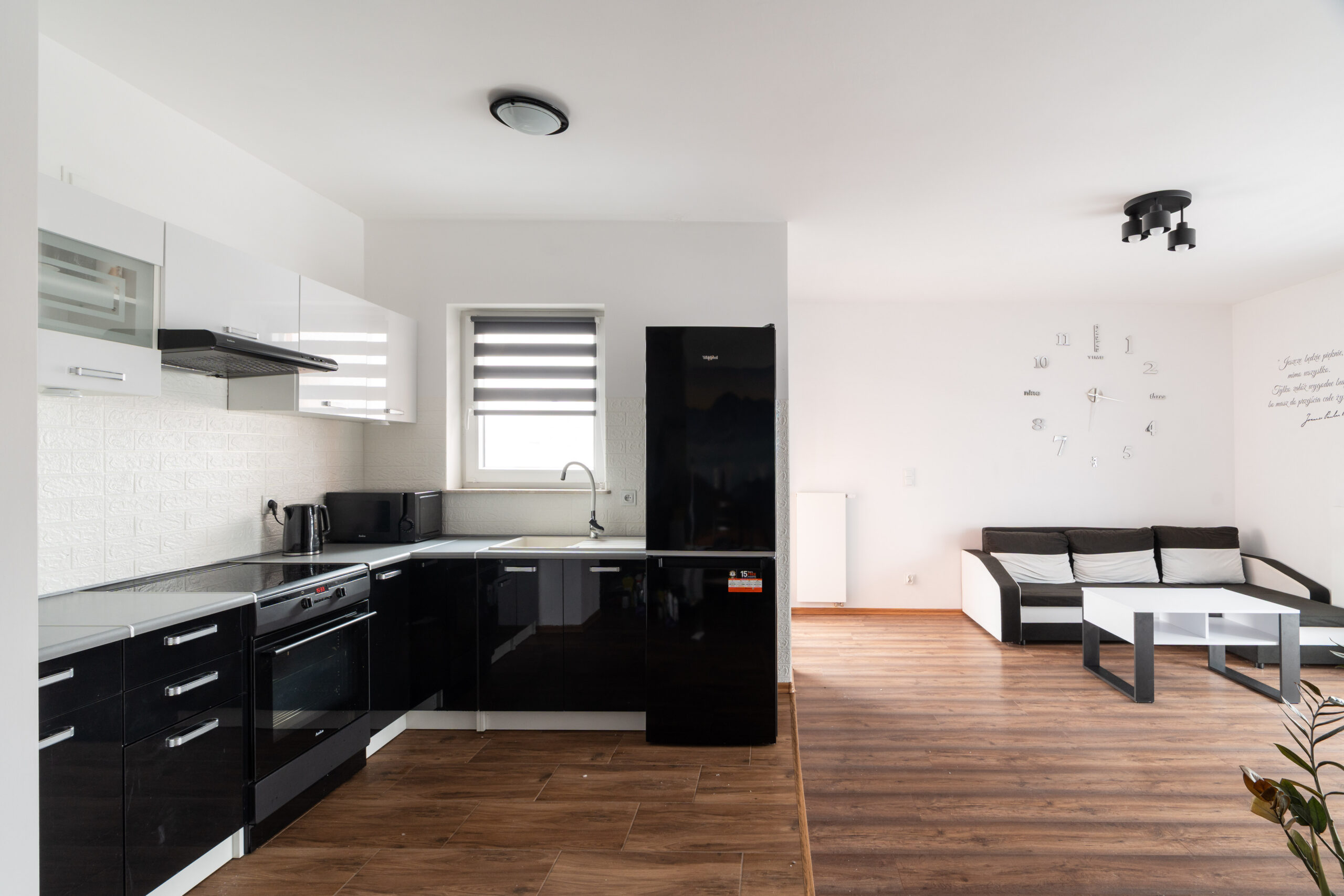 - Salon z aneksem kuchennym: Sercem mieszkania jest jasny salon z wyjściem na przestronny taras. Kuchnia jest w pełni wyposażona w zabudowę oraz niezbędny sprzęt AGD.