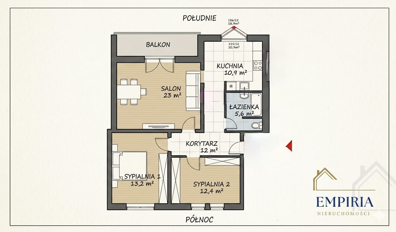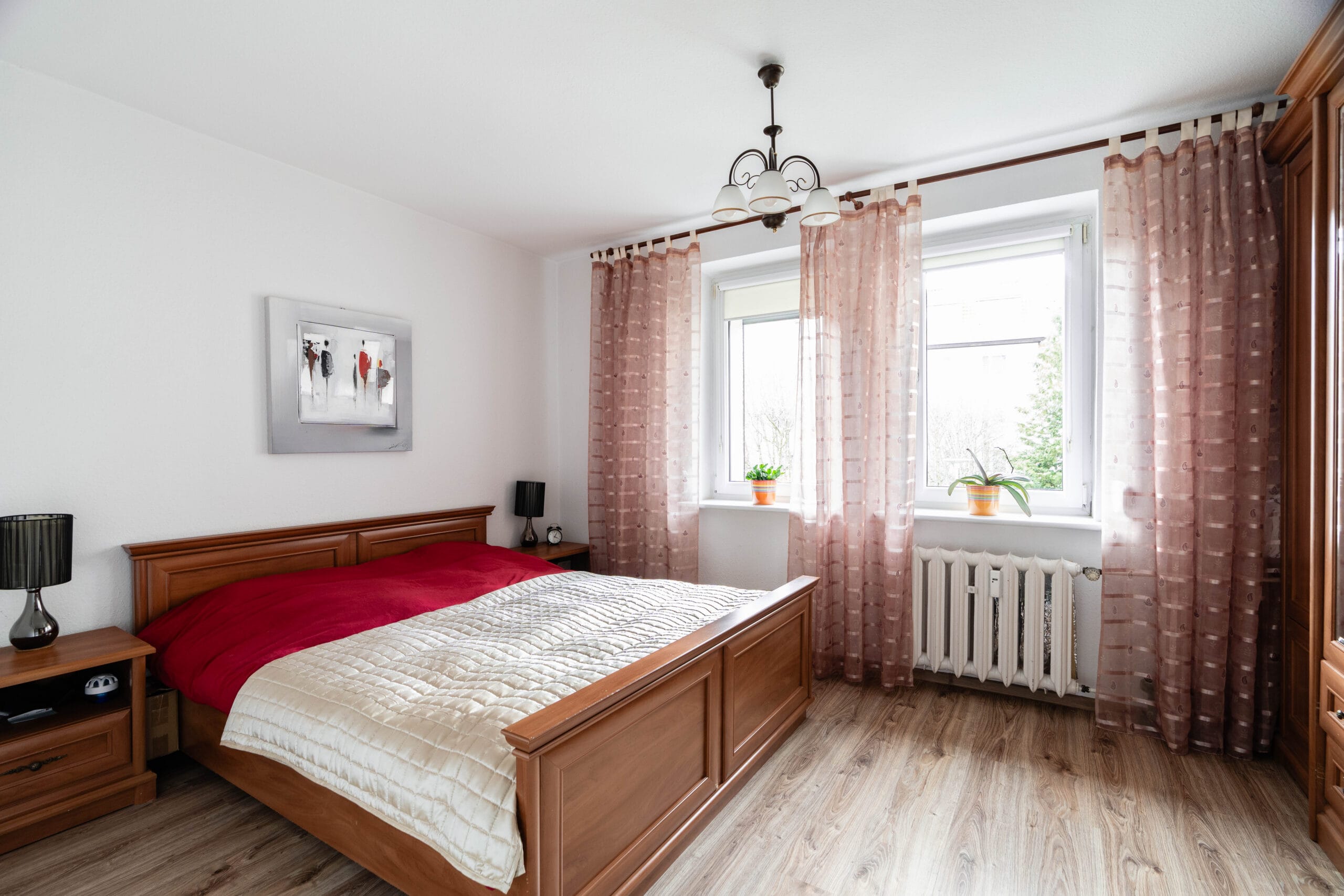 - Dwie niezależne sypialnie (13 m² i 12 m²): ustawne pokoje od strony północnej – idealne dla dzieci lub jako sypialnia główna.